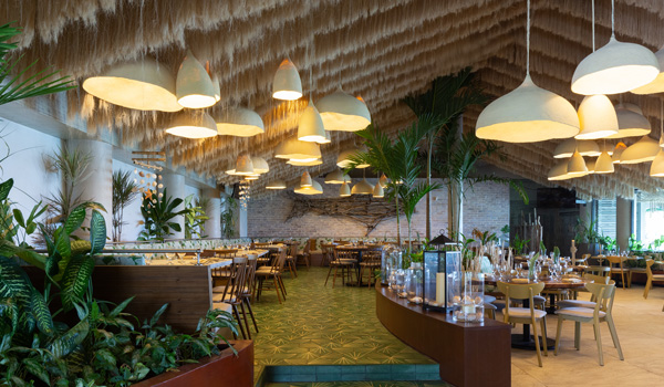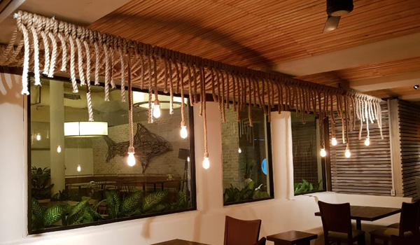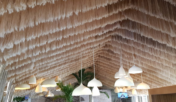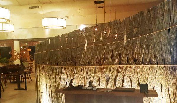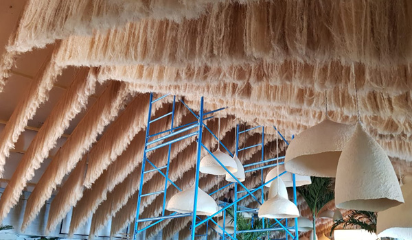 Plafón. Realizado con cuerda de yute. En total fueron 33 cortinas de 12.20mts de largo. Se necesitaron 21.5km de mecate para cubrir más 400m2 de plafón.