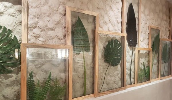Cuadros Decorativos. Hojas artificiales de diferentes tamaños y formas enmarcadas con madera de pino.