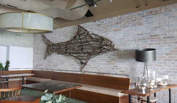 Pez de Madera. Decoración en muro fabricado a base de ramas y cortezas de madera dando forma a un pez. Sus medidas son de 5mt de largo por 2mt de alto.