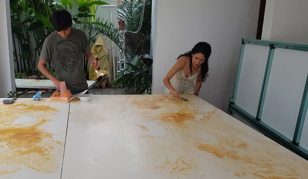 Panel contrabarra: el arte de este panel se llevó a cabo por Diana Torres, su trabajo fue realizado con hoja de oro y pasta vinílica.