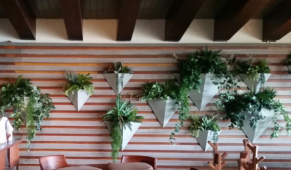Macetas triangulares: fabricadas en fibra de vidrio y vegetación artificial.