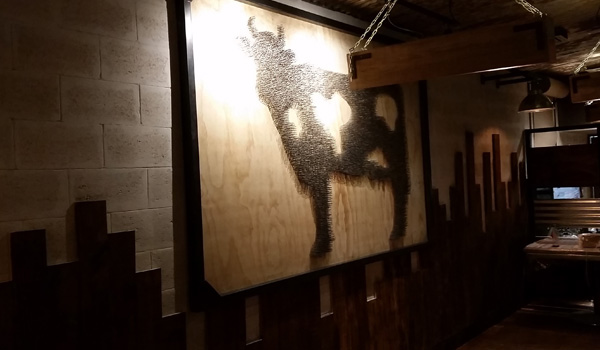 Vaca clavos: silueta en forma de vaca rellena de clavos sobre triplay con marco de PTR acabado fierro natural.