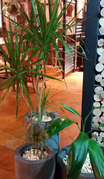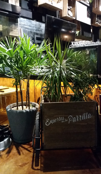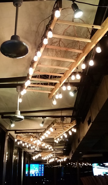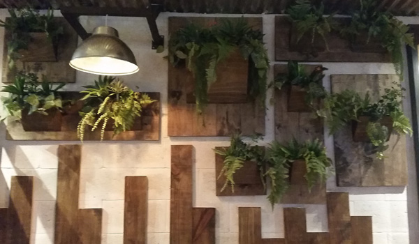 Lámpara escalera: escalera de madera con serie de focos incandescentes. Macetas: fabricadas con concreto, cuentan con vegetación artificial.
