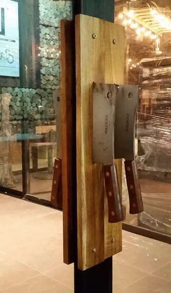 Cuchillo carnicero: jaladera de puerta fabricada con tablón y cuchillo de carnicero.