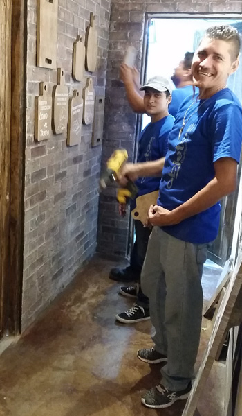 Decoración: Se instalaron diversos elementos de decoración como ollas y sartenes de cobre, cuchillos con aspecto desgastados, utensilios de cocina de diferentes modelos y frascos con conservas aceites y especias.