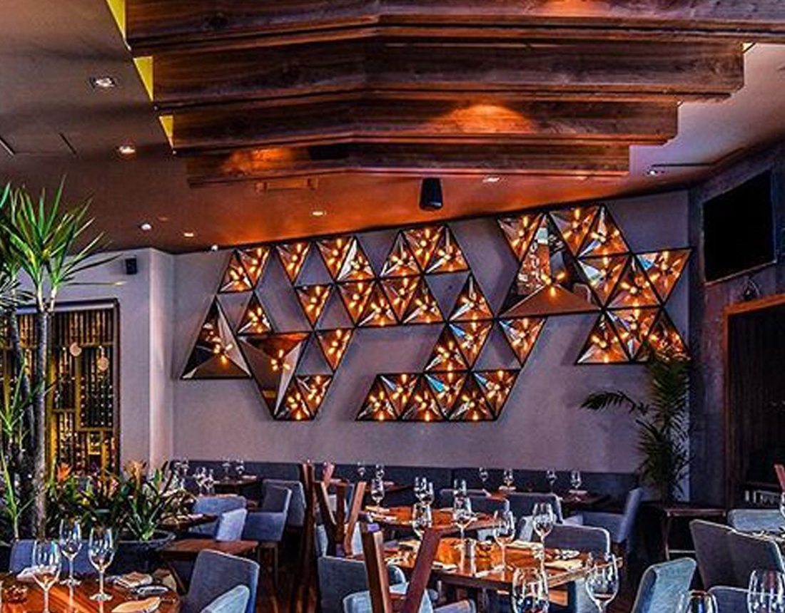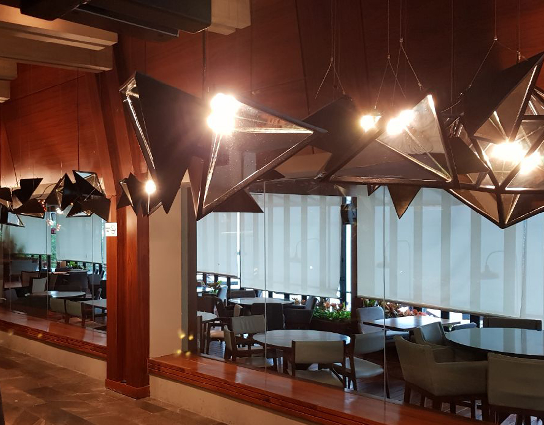 Lámpara Polígonos, 2017 Diseño: Concepto Visual Estudio Técnica: 78 módulos de fibra de vidrio, espejos y focos led. Lugar: Porfirio’s, Cancún Q. Roo