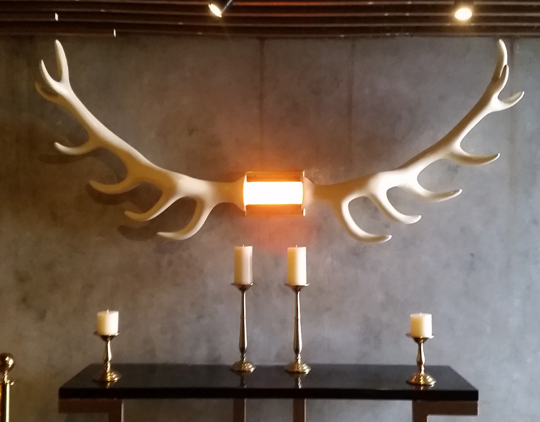 Lámpara Cuernos, 2017 Diseño: Concepto Visual Estudio Técnica: Fibra de vidrio tono marfil con foco y pantalla de cristal. Lugar: HRoof, Cancún Q. Roo