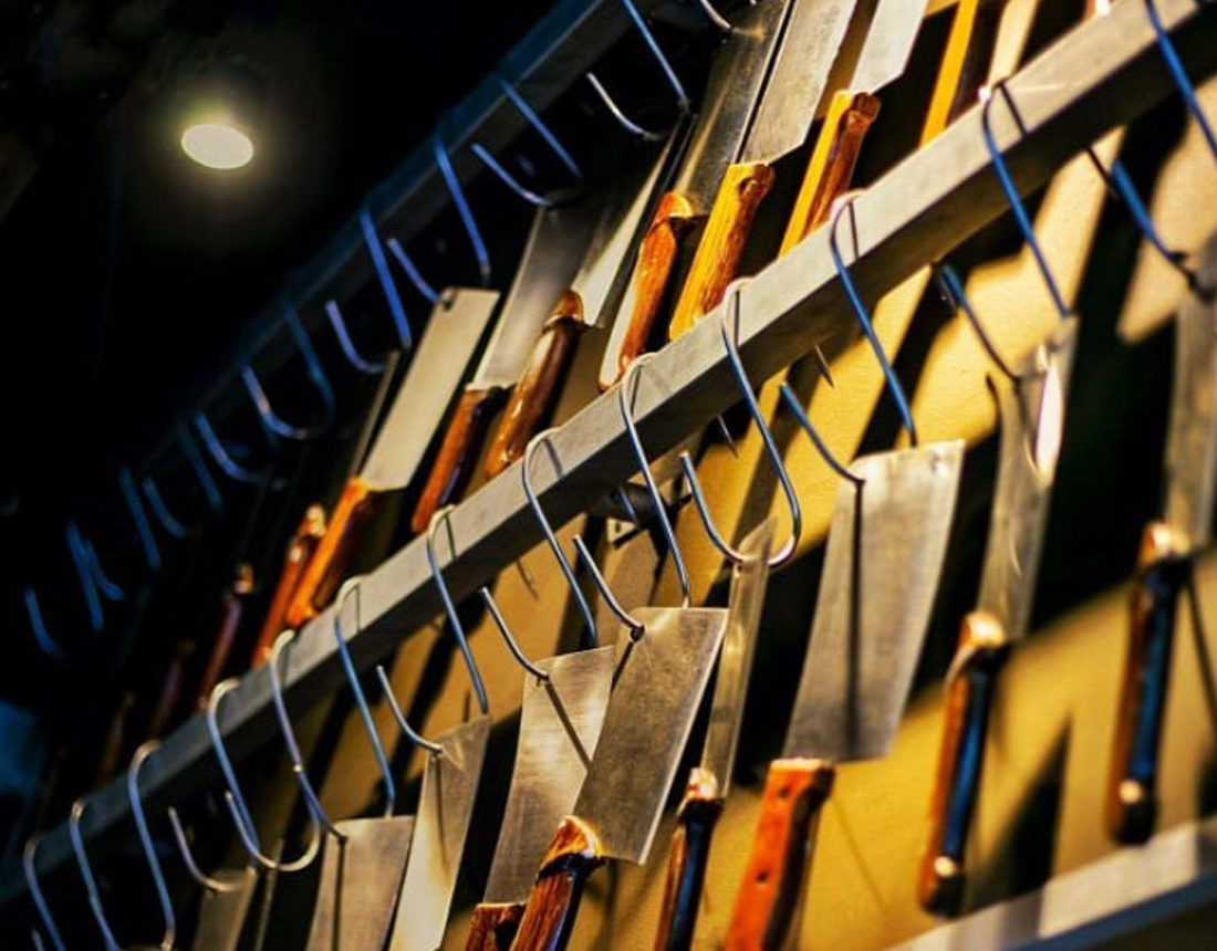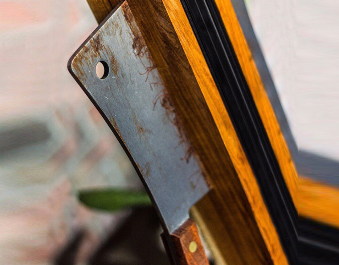 Jaladera Cuchillo Carnicero, 2017 Diseño: Concepto Visual Estudio Técnica: Cuchillo original en tablón de madera. Lugar: La Vicenta Azuna, Cancún.