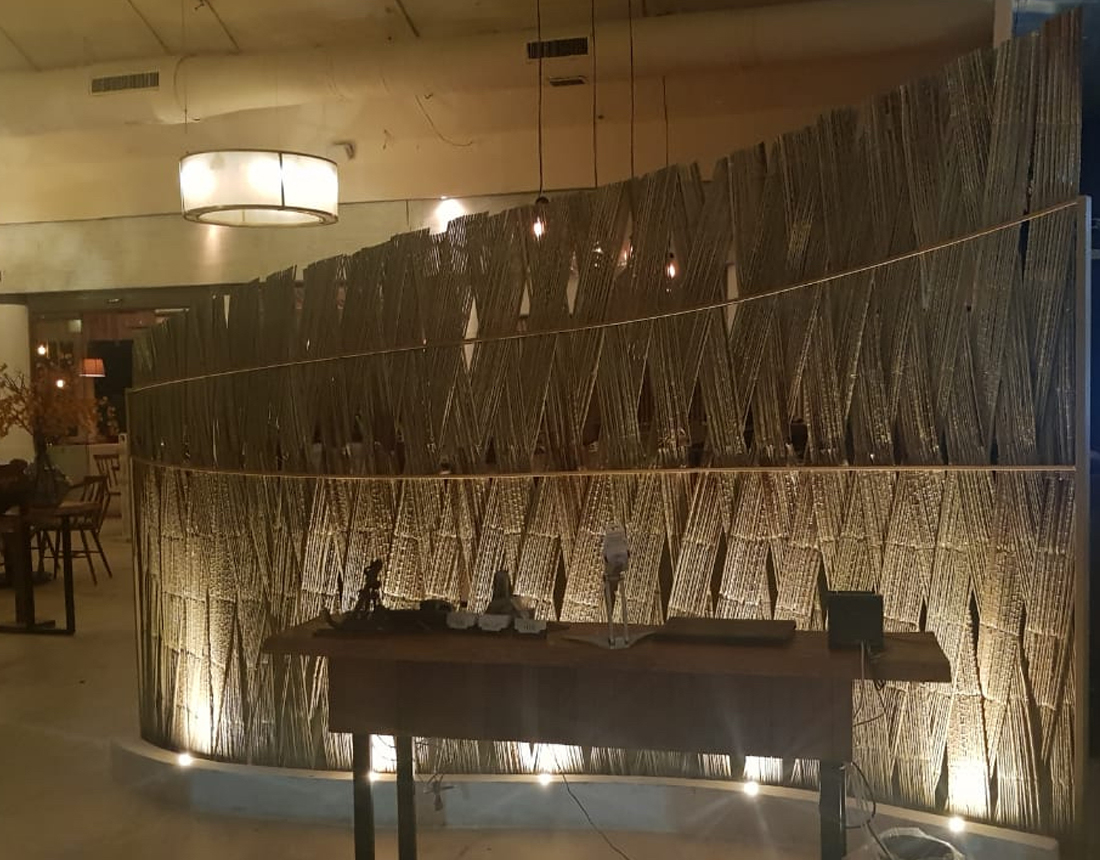 Mampara Tejida, 2018 Diseño: Concepto Visual Estudio Técnica: Elaborada con carrizo tejido con estructura base de solera. Lugar: Fred’s Cancún, Cancún Q. Roo